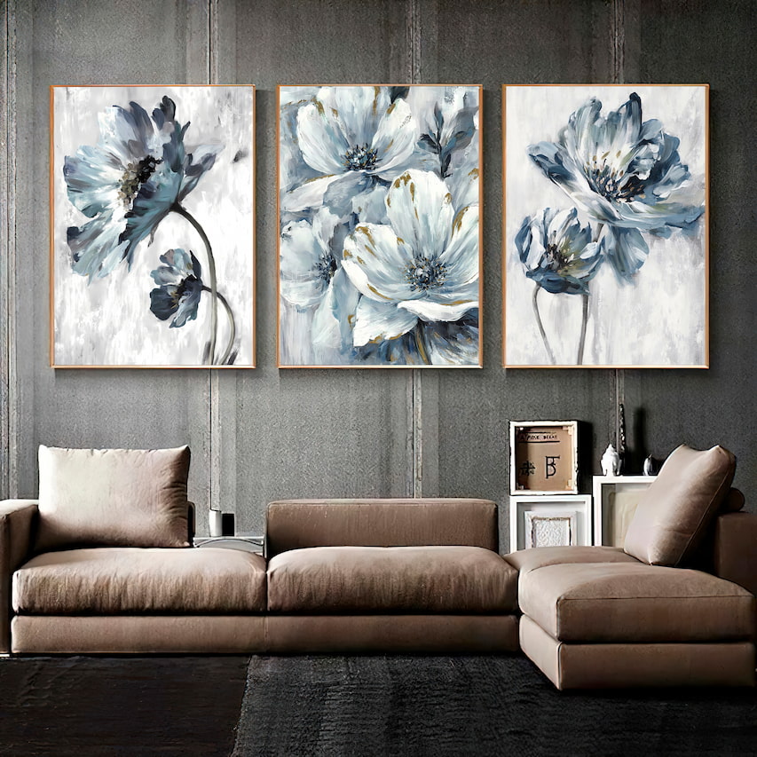 Por exemplo, se você colocar em paredes largas você deve usar quadros horizontais ou kits que deixam o sentido na horizontal, acompanhando a parede.